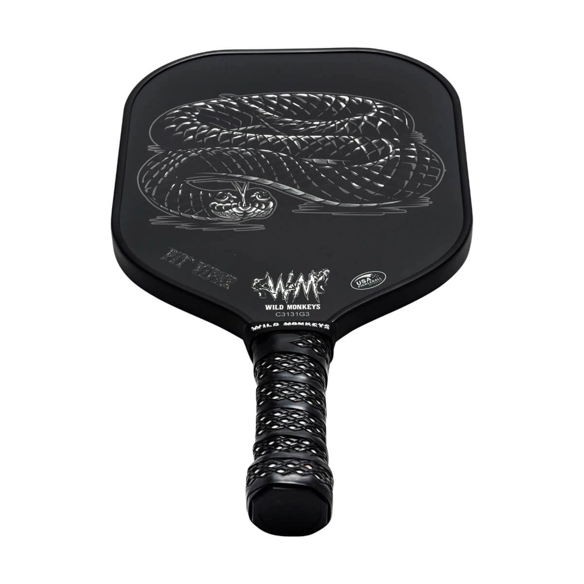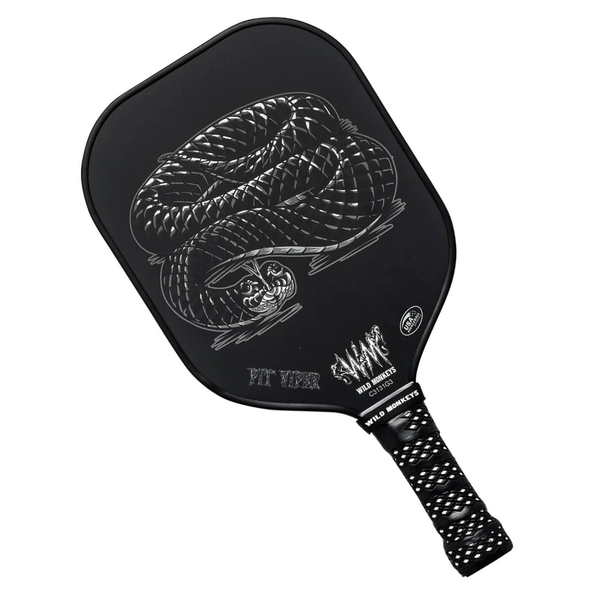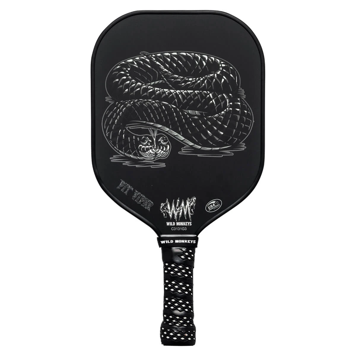 Wild Monkeys Pit Viper Middleweight Carbon Fiber Pickleball Paddle is a middleweight carbon fiber pickleball paddle designed for speed, power and accuracy — much like the cottonmouth or water moccasin so well known and respected across the Southeast. Players can strike from anywhere on the court and transition seamlessly between fast hands at the net and power shots when the opportunity presents itself. The core is 13.5mm thick polypropylene honeycomb built for balance and built to last.